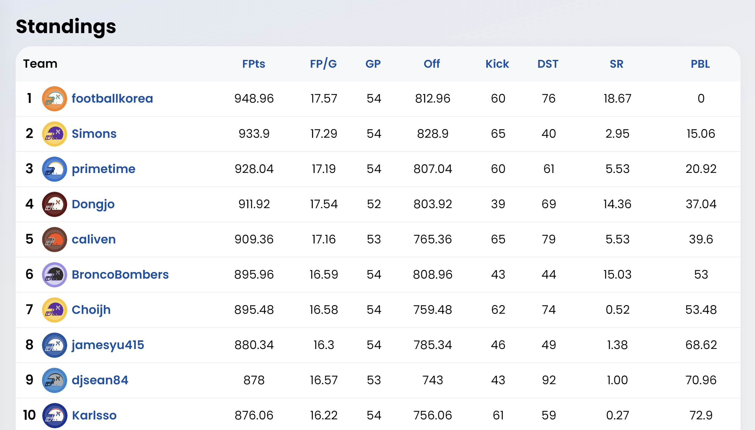 OFF: QB/RB/WR/TE 득점 포인트 KICK: 키커 득점 포인트 DST: 수비팀 득점 포인트
